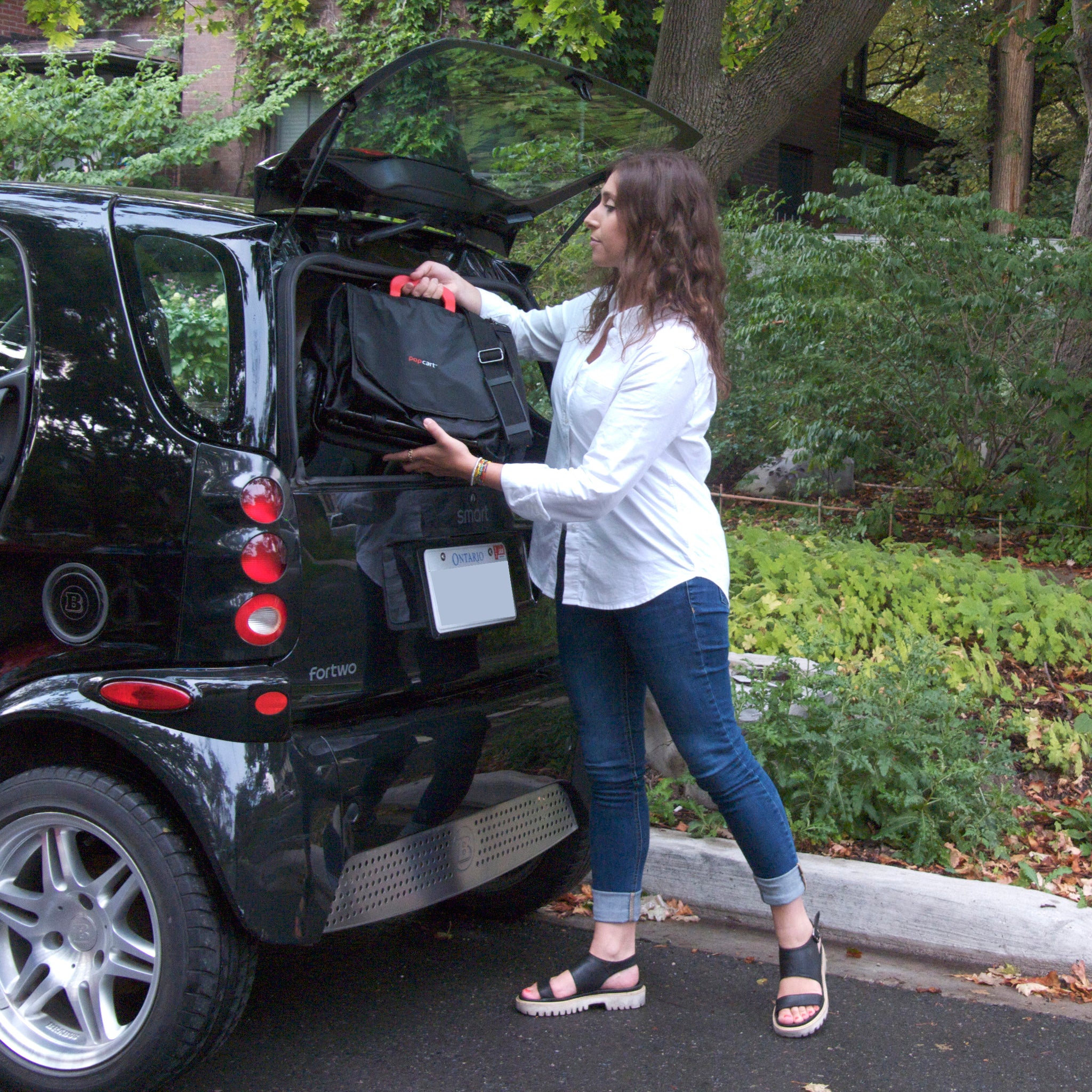 Use "popcart" shopping cart to carry groceries from the trunk of your car into your condo.